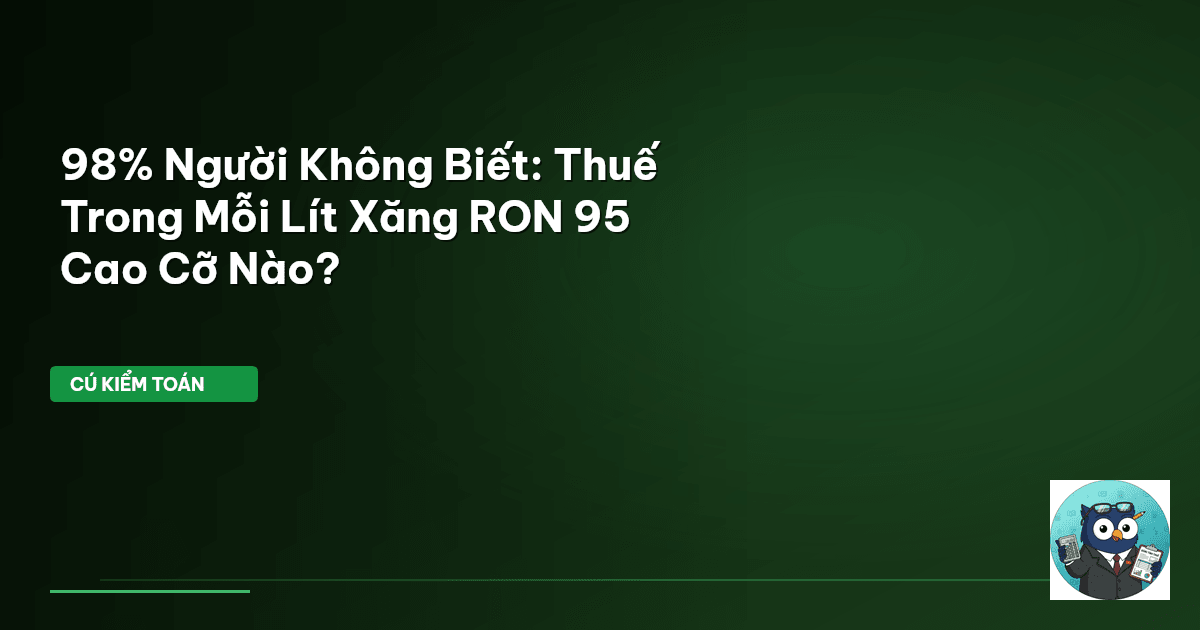 ⏱️ 13 phút đọc · 2422 từ Giới Thiệu: Phía Sau Con Số 23.760 VND/Lít Xăng RON 95 Giá xăng luôn là vấn đề nóng, ảnh hưởng trực tiếp đến túi tiền của mỗi người dân và chi phí hoạt động của doanh nghiệp. Nhìn con số RON 95 ở mức 23.760 VND/lít (theo dữ liệu pvoil-scraper, 2026-04-15), ít ai thực sự hiểu được các thành phần cấu thành bên trong. Đó không chỉ là giá dầu thô thế giới, chi phí vận chuyển hay lợi nhuận của doanh nghiệp. Phần lớn còn lại chính là các loại thuế và phí mà Cú Kiểm Toán sẽ 'mổ…