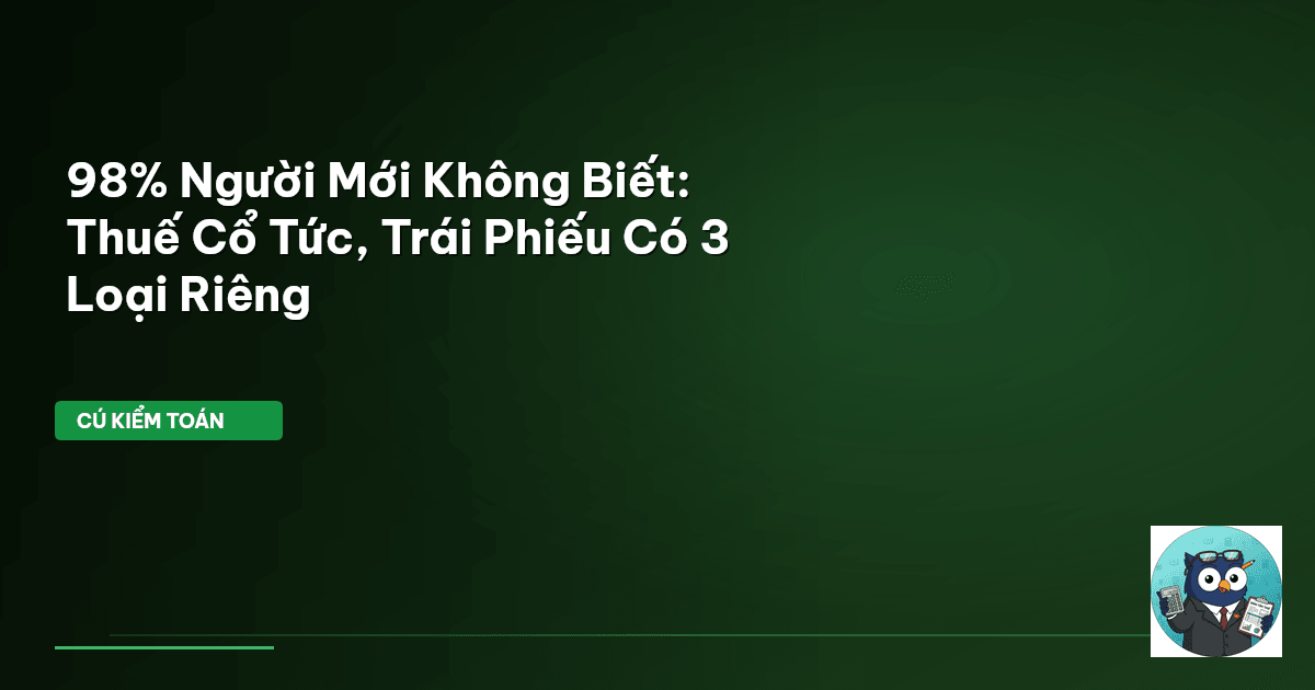 Cú Kiểm Toán hôm nay sẽ "soi kỹ từng con số" để bạn nắm rõ ba loại thuế chính tác động đến khoản đầu tư vào cổ tức, chứng khoán và trái phiếu. Chúng ta sẽ cùng bóc tách từng quy định, từng công thức, đảm bảo bạn không bỏ lỡ bất kỳ điều khoản quan trọng nào. Nắm vững luật chơi thuế là chìa khóa để bảo vệ tài sản và tối ưu hóa lợi nhuận thực tế.