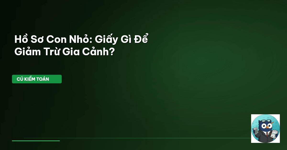 ⏱️ 8 phút đọc · 1518 từ Giảm Trừ Gia Cảnh Cho Con Nhỏ: Giấy Tờ Nào Mới Chuẩn? Giảm trừ gia cảnh. Con số vàng cho người nộp thuế. Mỗi người phụ thuộc , cụ thể là con nhỏ, có thể giúp bạn giảm 4.4 triệu đồng vào thu nhập chịu thuế mỗi tháng. Tính ra, đây là khoản tiết kiệm không hề nhỏ. Nhưng kê khai thế nào, hồ sơ ra sao để không mất quyền lợi? Đó mới là vấn đề nhiều người đau đầu. Cú Kiểm Toán biết bạn cần sự rõ ràng. Chúng ta sẽ soi kỹ từng chi tiết trong quy định về hồ sơ chứng minh người phụ …