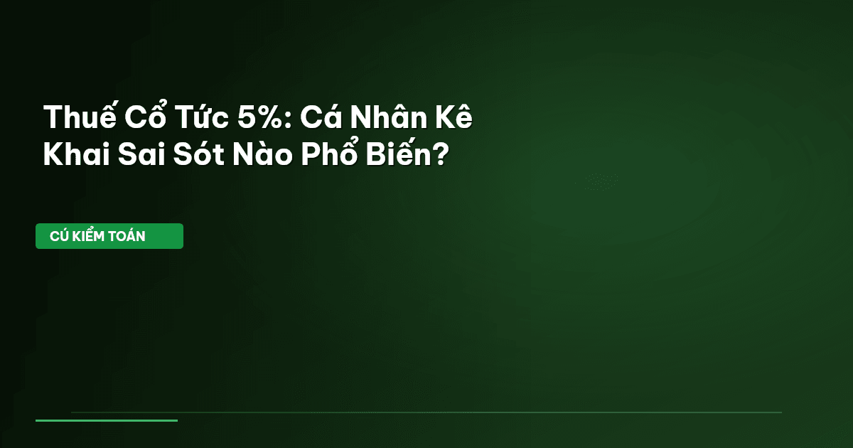 ⏱️ 8 phút đọc · 1573 từ Giới Thiệu Cổ tức tiền mặt – một khoản thu nhập hấp dẫn với nhiều nhà đầu tư cá nhân. Nghe có vẻ đơn giản: chỉ 5% thuế. Nhưng Cú Kiểm Toán đã soi kỹ, và phát hiện không ít cá nhân đang vướng vào những sai sót cơ bản khi kê khai, dù là do hiểu lầm hay chủ quan. Các quy định về thuế cổ tức, tưởng chừng cố định, lại ẩn chứa những chi tiết quan trọng mà nếu không nắm rõ, bạn có thể vô tình vi phạm hoặc bỏ lỡ cơ hội minh bạch tài chính của mình. Trong bối cảnh nền kinh tế số h…