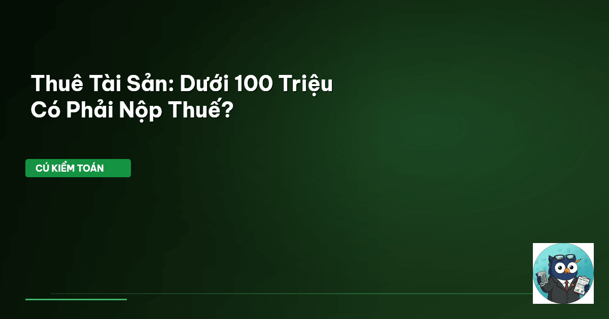 ⏱️ 9 phút đọc · 1762 từ Giới Thiệu: 100 Triệu Đồng – Ngưỡng Vàng Mà Ai Cũng Cần Biết Cho thuê tài sản, dù là nhà, căn hộ hay mặt bằng kinh doanh, đang là kênh đầu tư sinh lời hấp dẫn. Nhưng, Cú Kiểm Toán xin nhắc nhở: Lợi nhuận phải đi đôi với nghĩa vụ thuế. Không ít cá nhân hay hộ kinh doanh lầm tưởng rằng mọi khoản thu từ cho thuê đều phải nộp thuế. Sự thật? Không hẳn. Có một ngưỡng quan trọng, một con số "vàng" mà nếu nắm rõ, bạn có thể hoàn toàn yên tâm. Đó chính là 100 triệu đồng doanh thu …