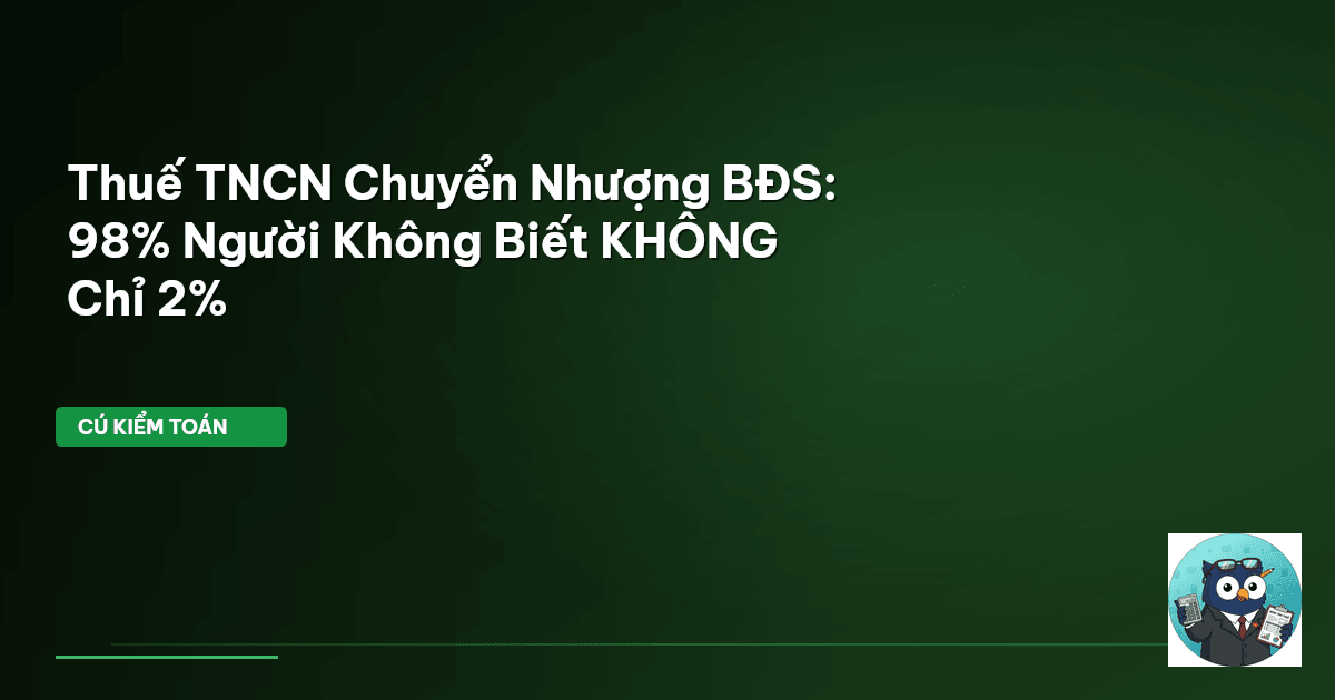 ⏱️ 11 phút đọc · 2044 từ Giới Thiệu: Ẩn Số Đằng Sau 2% Thuế Chuyển Nhượng BĐS Nhiều người, khi nhắc đến thuế thu nhập cá nhân (TNCN) từ chuyển nhượng bất động sản (BĐS), ngay lập tức nghĩ đến con số 2%. Đơn giản. Dễ nhớ. Nhưng Cú Kiểm Toán xin cảnh báo: con số đó chỉ là bề nổi của tảng băng chìm. Thực tế, quy định thuế TNCN chuyển nhượng BĐS có rất nhiều trường hợp đặc biệt, miễn giảm, và cách xác định giá tính thuế phức tạp hơn bạn tưởng rất nhiều. Bỏ qua những chi tiết này là bạn đang tự nguyệ…