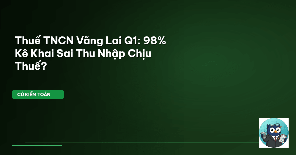 ⏱️ 13 phút đọc · 2415 từ Giới Thiệu: Thuế TNCN Vãng Lai Quý 1 – Đừng Để Sai Sót Nhỏ Thành Phạt Lớn Quý 1 đã qua, và giờ là lúc các cá nhân có thu nhập vãng lai cần rà soát nghĩa vụ Thuế Thu Nhập Cá Nhân (TNCN). Nhiều người nghĩ thu nhập vãng lai là nhỏ, không đáng kể, hoặc "chưa tới mức phải đóng". Đó là một suy nghĩ sai lầm, dẫn đến những sai sót không đáng có khi quyết toán thuế, thậm chí là bị phạt. Cú Kiểm Toán nhìn thấy 98% người nộp thuế vãng lai thường mắc phải sai lầm ngay từ bước đầu ti…